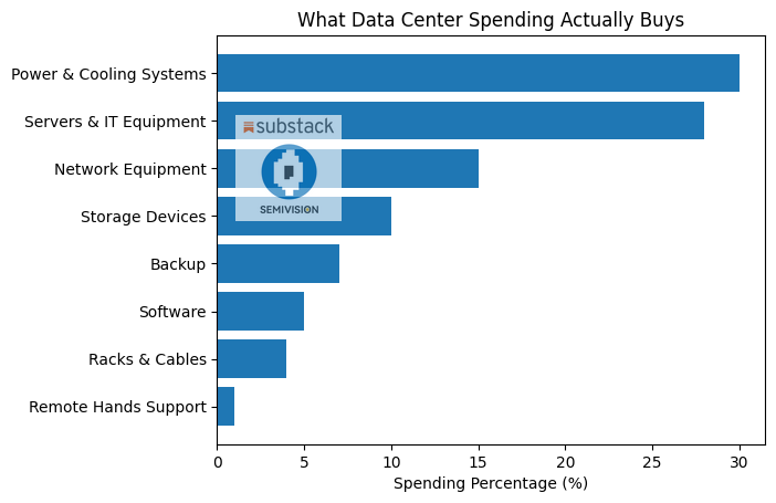 What stands out is that data centers are not primarily IT purchases—they are infrastructure systems engineered to sustain high-density computation. Nearly one-third of spending goes to energy and thermal management, highlighting a key reality of the AI era: