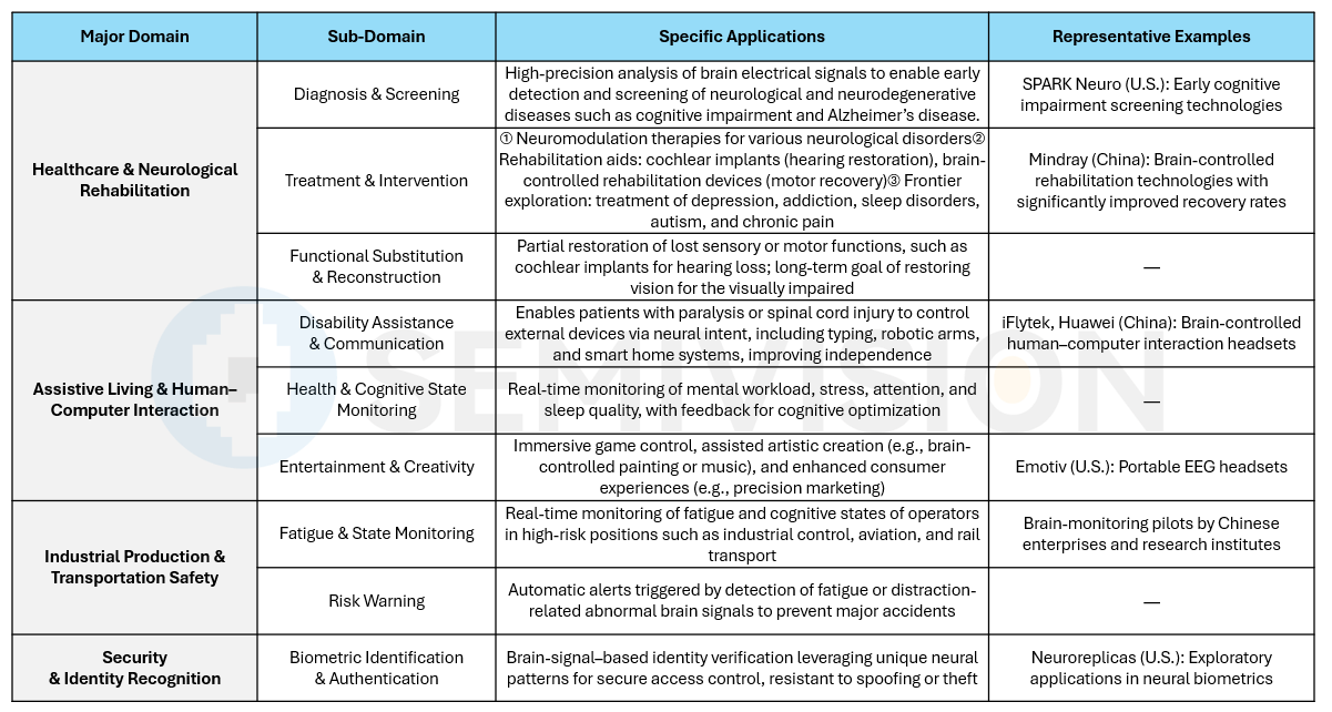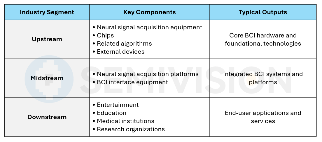 The midstream segment focuses on system integration and platform scalability, which determine whether brain–computer interface technologies can evolve from isolated technical breakthroughs into large-scale, deployable systems.
