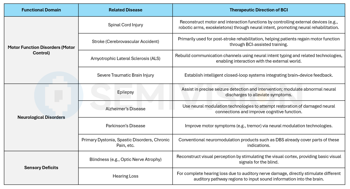The disability field encompasses groups experiencing loss or limitation of motor function due to aging, chronic diseases (such as Alzheimer’s disease and severe stroke), congenital disabilities, severe accidents (such as spinal cord injury), and more. Brain-computer interfaces offer clear application pathways and related products in rehabilitation training and motor function recovery, helping patients improve their quality of life and restore partial mobility.