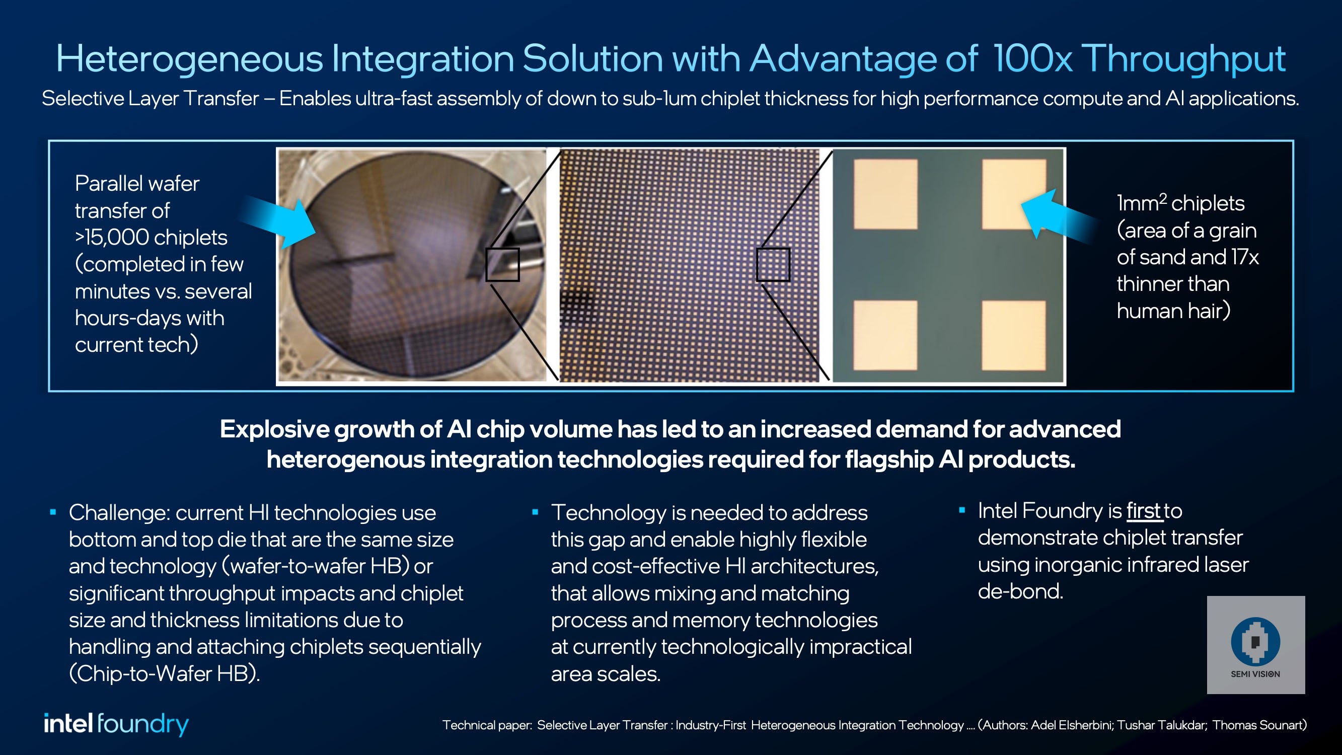 Intel introduced a breakthrough by utilizing inorganic infrared lasers to debond over 15,000 chiplets (each measuring 1 mm²) from a single wafer within minutes. They emphasized the importance of modularity in future chiplet stacking technologies and announced developments in next-generation EMIB.