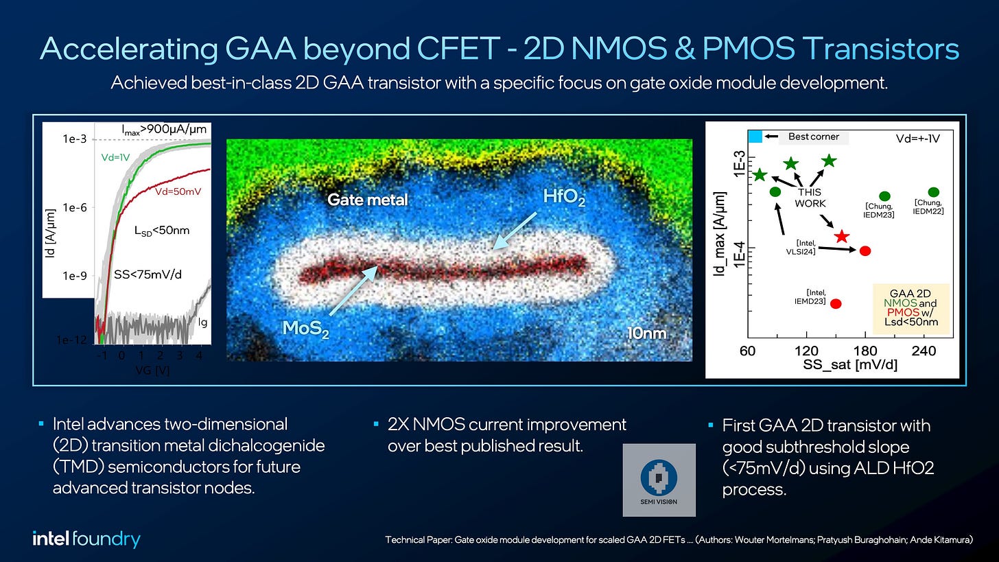 Additionally, improvements in GAA performance were demonstrated by covering molybdenum disulfide (MoS₂) electrodes with hafnium oxide (HfO₂), achieving subthreshold swing improvements (75 mV/d or better). This advancement reinforces the possibility of sustaining Moore's Law with GAA technology, a topic expected to be explored in one of Intel's invited talks.