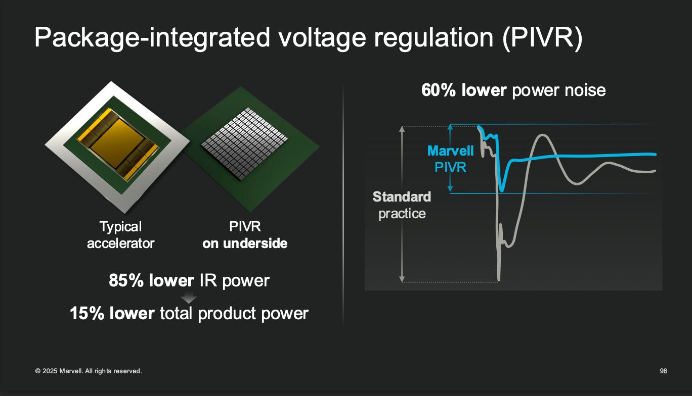 Marvell’s Package-Integrated Voltage Regulator (PIVR) technology, introduced in 2025, is a critical solution to the power delivery challenges faced by high-power AI and cloud data center chips. As AI processors surpass the multi-kilowatt power range, traditional board-level power delivery architectures encounter severe bottlenecks: long high-current, low-voltage paths, significant IR losses, slow transient response, and difficult-to-manage power noise. PIVR addresses these issues by integrating the voltage regulator directly into the chip package, minimizing power delivery distance, dramatically reducing parasitic inductance and voltage drop, improving IR losses by up to 85%, and lowering power loop noise by roughly 60%. This proximity-based power delivery method not only enhances transient response but also supports high-performance server platforms exceeding 4 kW, making it essential for high-speed SerDes, CXL, and optical-electrical co-packaged architectures.