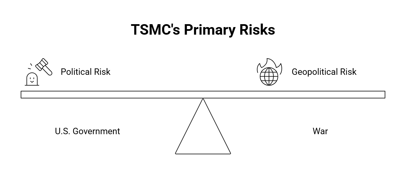 The second risk — war — is even more fundamental. Semiconductor fabrication is an ultra-concentrated, capital-intensive activity. A single advanced fab represents tens of billions of dollars in equipment and years of accumulated process learning. Any large-scale military disruption in the region would not simply reduce output; it could halt or destroy the physical base of production. That is a risk no market competitor can match in magnitude.